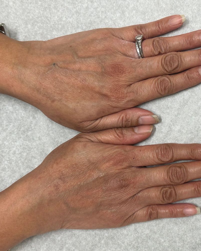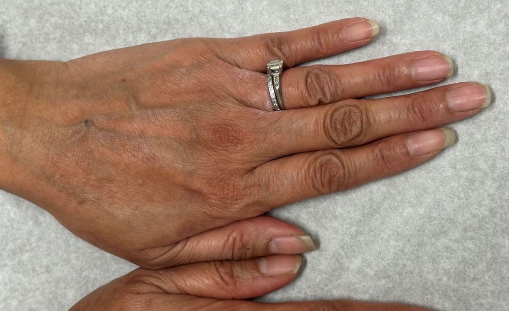 Given the patient’s comprehensive prior patch testing and lack of new exposures, additional patch testing was not pursued. The clinical presentation did not suggest secondary infection, and in the absence of concerning features, bacterial cultures were deferred. The working diagnosis was chronic hand eczema persisting despite otherwise well-controlled atopic dermatitis on systemic therapy. Although visible inflammation was limited, disease was chronic, symptomatic, and consistent with moderate-to-severe chronic hand eczema based on persistence and treatment refractoriness.