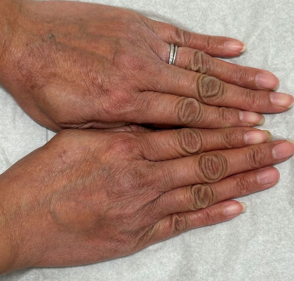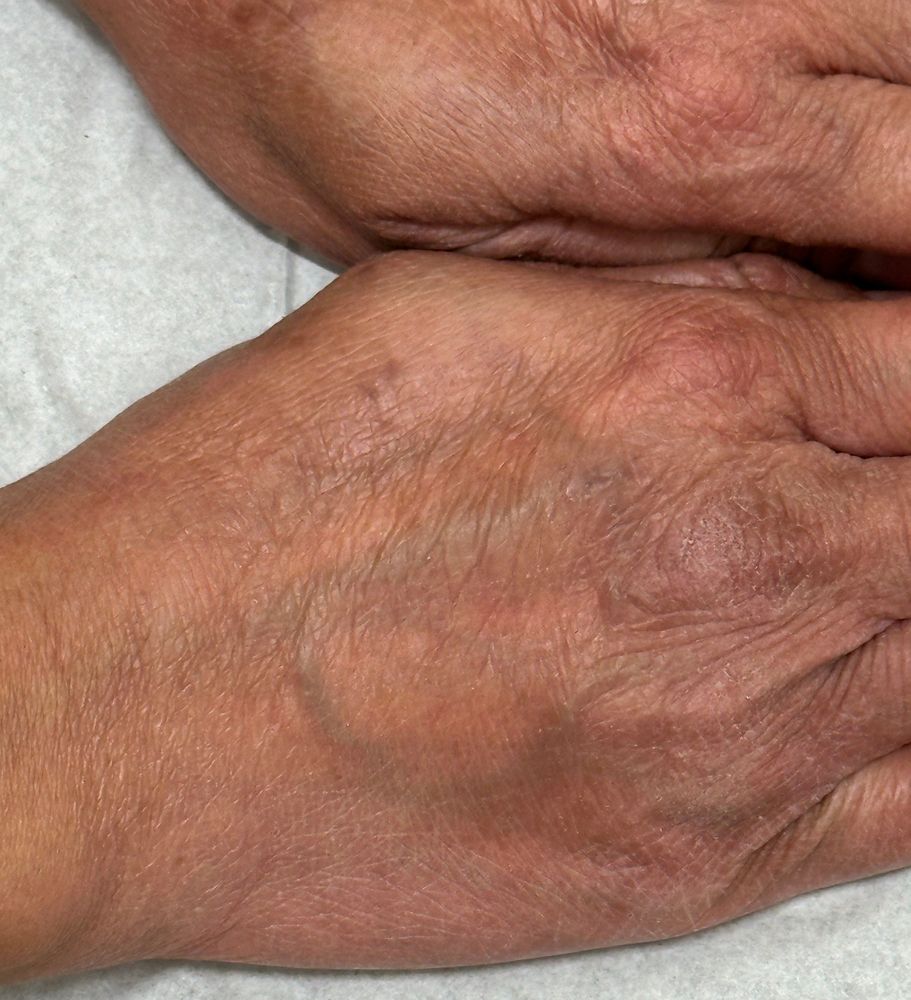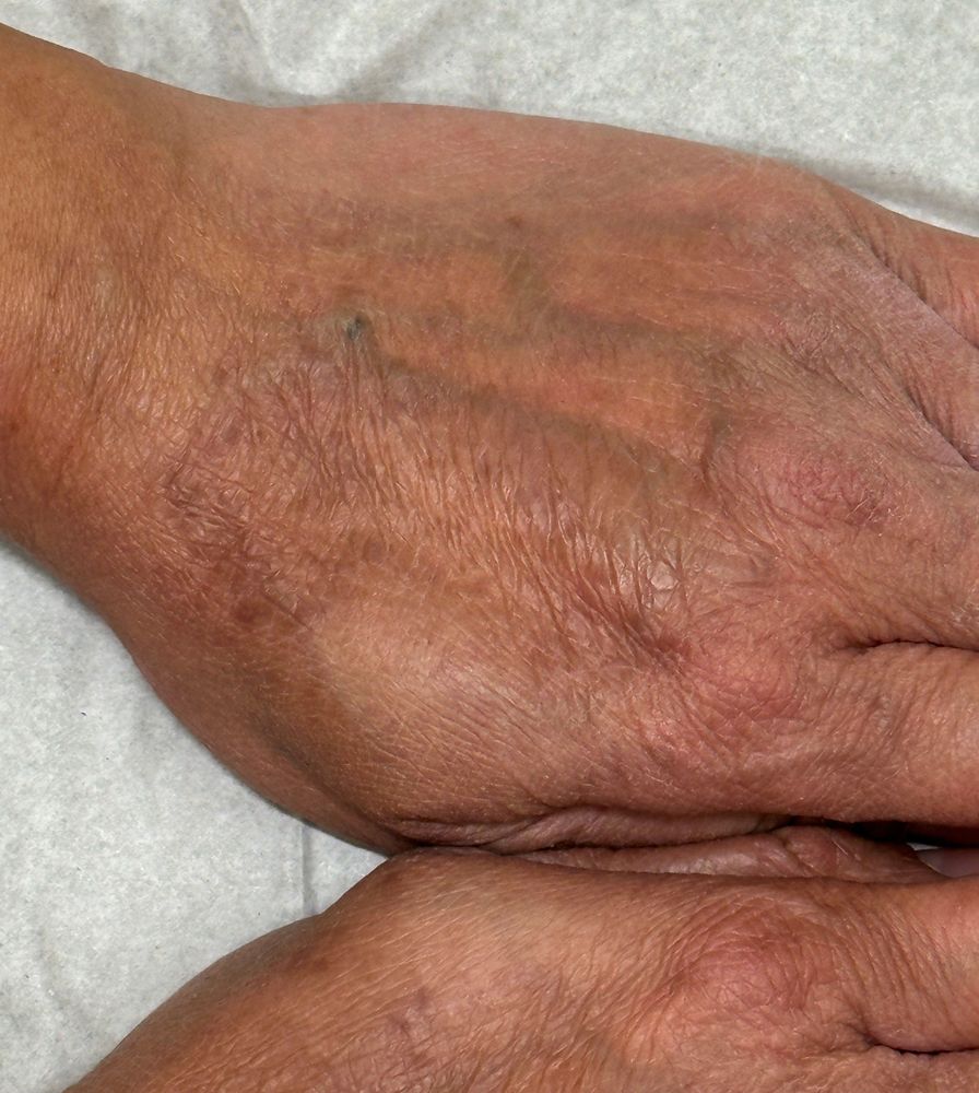 At a follow-up visit on December 9, 2025, the patient reported continued satisfaction with her global atopic dermatitis control. However, she noted that her hands remained symptomatic despite twice-daily application of ruxolitinib cream for several weeks, with little to no improvement.