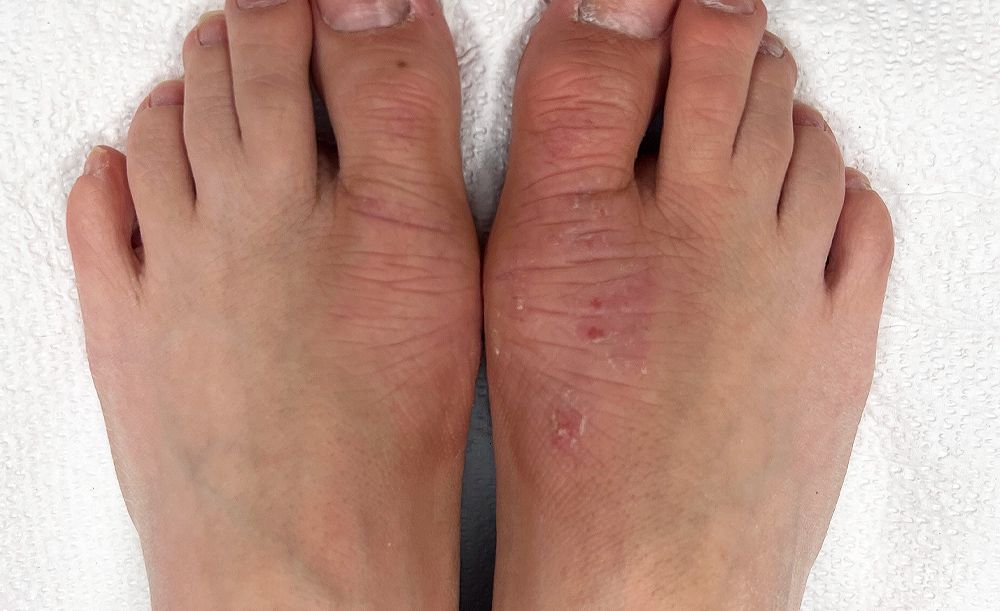 A 15-year-old male presented accompanied by his mother with a flare of atopic dermatitis primarily affecting his hands and feet over the past 2 months. The “rash” was severely pruritic throughout the day and was notably worse in the evening, often interfering with his ability to fall asleep and/or waking him up from sleep on most evenings. The patient and his mother both emphasized that the rash and itching were progressively worsening.