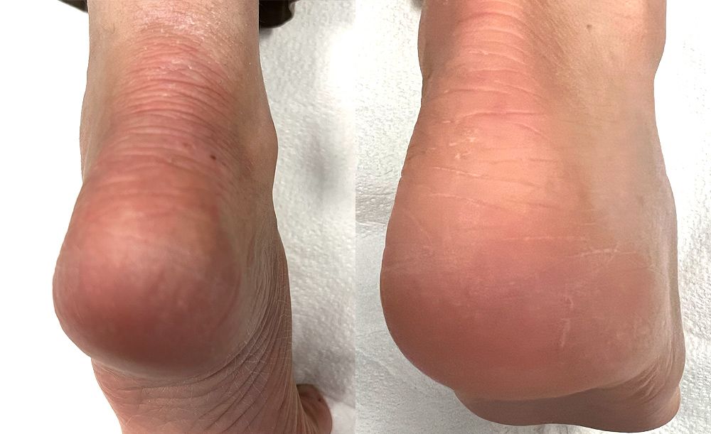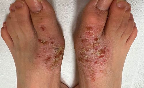As shown in the follow-up photos, the eczematous areas on the hands and feet were almost clear, with some persistence of erythema and focal lichenification on the feet, which were both markedly decreased from baseline. Scaling was significantly decreased and excoriations and crusting were completely resolved.