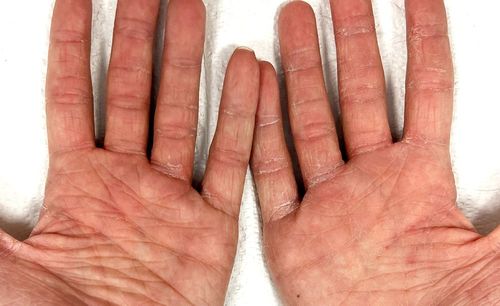 The patient was cooperative, admittedly anxious about his condition, able to verbally communicate clearly, and with normal vital signs and overall normal general appearance other than the skin findings. As noted in the baseline photographs, the palmar surface of hands was affected diffusely by erythema, xerosis, fine scaling, superficial fissuring, slight swelling, excoriations, lichenification, and hyperlinearity of the palms and soles.