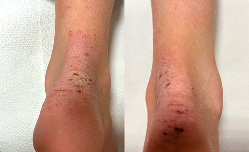 The distal dorsal feet and posterior ankles were affected similarly, with a greater magnitude of crusting and excoriations. Xerosis is noted diffusely, primarily on the trunk and extremities. There was no warmth on palpation at the affected sites on the hands and feet, with absence of purulent exudate, or any signs of cellulitis.
