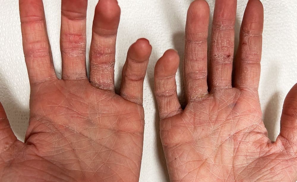 He stated he feels anxious and self-conscious due to his condition. He is embarrassed by the appearance of the “rash”, and actively avoids shaking hands with people or scratching the areas in public, the latter being quite difficult as the itching is often very intense. At times his hands are painful especially with firm grasping of objects due to skin fissuring in areas where the finger joints flex. Additionally, he avoids holding hands with his girlfriend as they are concerned whether there may be some type of “infection”.