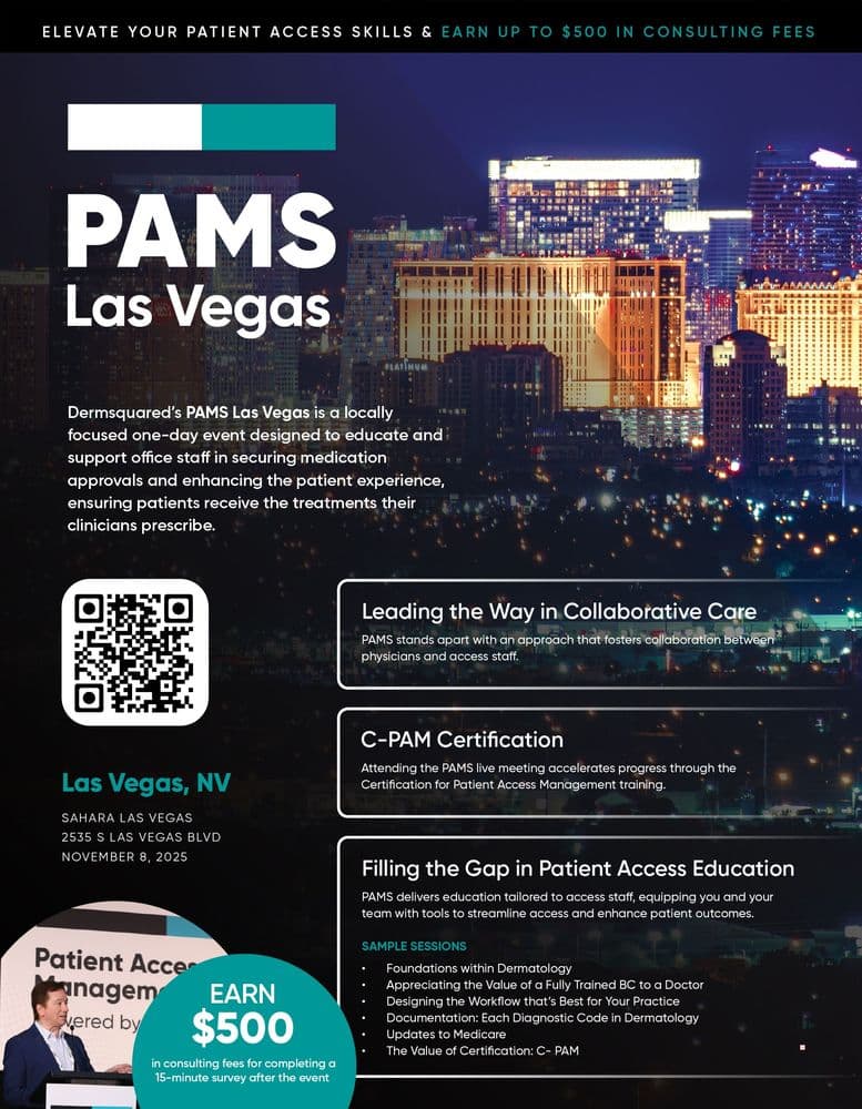 Dermsquared's PAMS Las Vegas is a locally focused one-day event designed to educate and support office staff in securing medication approvals and enhancing the patient experience, ensuring patients receive the treatments their clinicians prescribe.